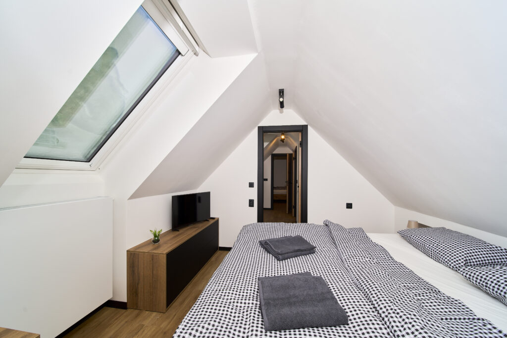 V horním podlaží je k dispozici dětská herna vybavená TV, samostatné WC, ložnice s TV a manželskou postelí o rozměru 160×200 cm a druhá ložnice s TV a jednolůžkovou postelí o rozměru 90×200 cm. Maximální kapacita apartmánu je 7 dospělých osob.