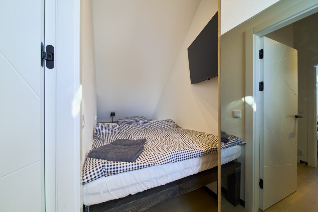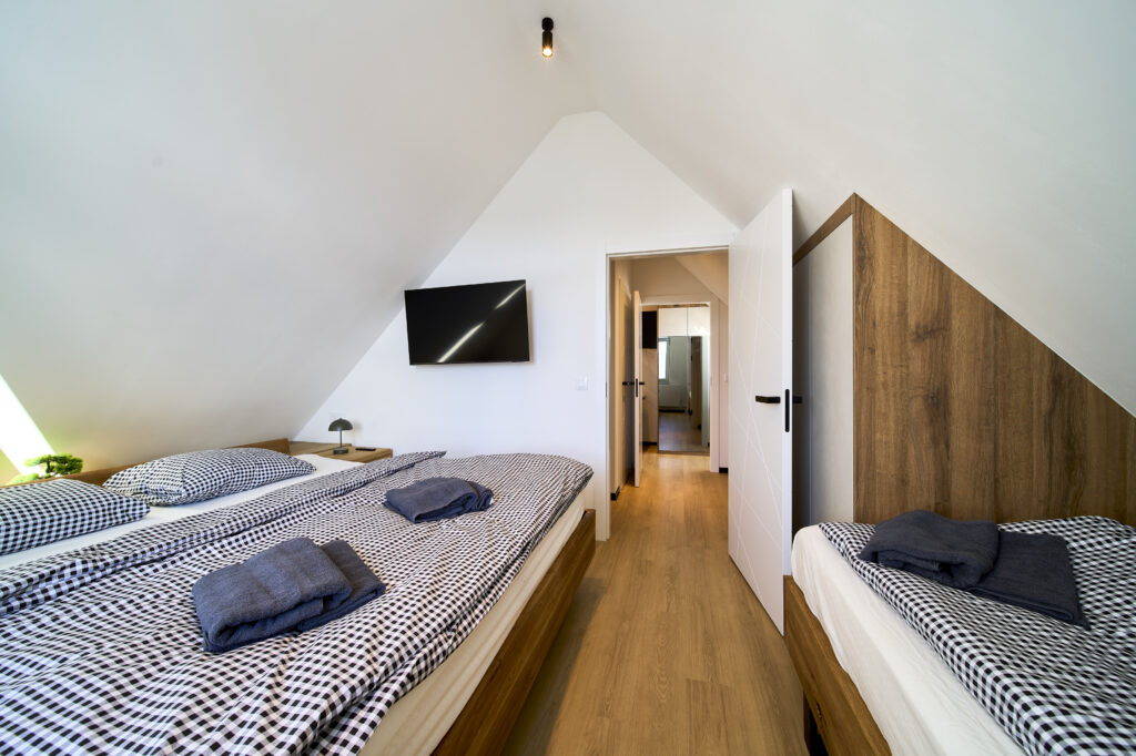 V horním podlaží je k dispozici malá galerie, samostatné WC, ložnice s TV, manželskou postelí o rozměru 200×200 cm a další jednolůžkovou postelí 90×200 cm a druhá ložnice s TV a postelí o rozměru 140×200 cm. Maximální kapacita apartmánu je 7 dospělých osob.